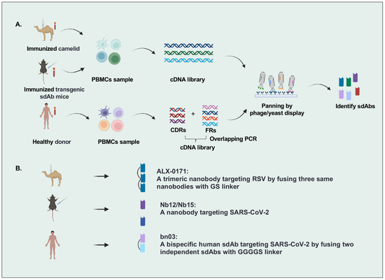 Overview of single-domain antibodies screening strategies. (A). Strategies to identify single-domain antibodies. In brief, VHH or VH genes are cloned from peripheral blood lymphocytes of specific-antigen immunized camelids, transgenic sdAb mice, or healthy donors, and then antigen-specific sdAbs are identified by phage/yeast display panning. (B). Representative single-domain antibodies against respiratory RNA viruses are identified by different strategies. Figure generated with BioRender.