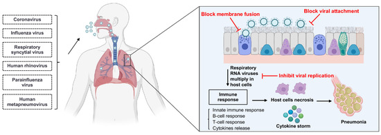 Respiratory diseases caused by various types of virus infections have been the focus of global health concerns and are one of the leading causes of death in developing countries [1]. According to the nucleic acid types, respiratory viruses can be divided into RNA and DNA viruses. However, the primary viruses causing the epidemics of respiratory infections in the last two decades were RNA viruses, such as the severe acute respiratory syndrome coronavirus (SARS-CoV) in 2003, the influenza H1N1 virus in 2009, the Middle East respiratory syndrome coronavirus (MERS-CoV) in 2012, and the SARS-CoV-2 in 2019 [2]. Therefore, the development of effective therapeutics for respiratory RNA viruses is rival to combat infectious diseases.