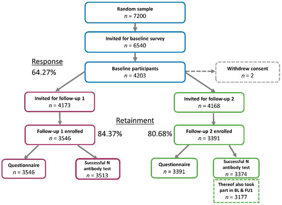 Among the 4203 participants enrolled at BL, 3546 participated in FU1 (November 2020; 84.1%) and 3391 in FU2 (April 2021; 80.4%). Overall 3196 participants took part in all BL, FU1 and FU2, resulting in a full participation ratio of 76.0%. (Figure 1 and Figure 2).