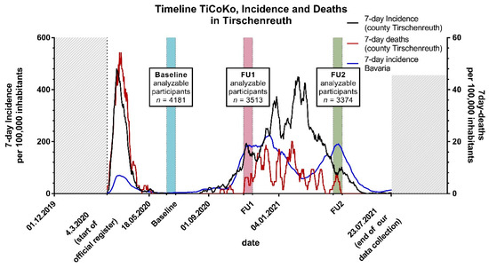 The cohort at baseline (BL) was described in detail in Wagner et al. 2021 [9]. In brief, 4203 randomly selected inhabitants of Tirschenreuth aged 14 years or older participated in the baseline survey of the TiKoCo study (response rate: 64.3%). Study participants came to the study center or requested a visit at home between 28th June and 13th July 2020.