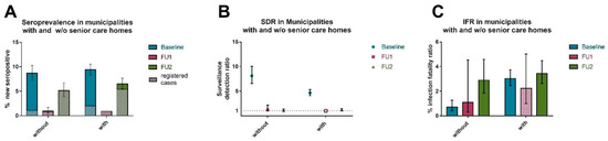 Senior care home residents make up for 1.4% of the county population and form a special group in terms of vulnerability to COVID-19. They contributed for almost 50% of COVID-19 related deaths in individuals 70+ years of age in spring 2020. Despite the offer of a home visit by the study team, participation rate of senior care home residents was low, rendering the calculation of estimates specific to this group unfeasible. As an approximation, we calculated standardized new seropositivity, SDR and IFRs separately for municipalities with and for municipalities without a senior care home. New seropositivity was comparable for all three intervals, BL, BL to FU and FU1 to FU2, respectively. However, at BL, the SDR was 4.66 (95%-CI 4.08–5.32) for municipalities with senior care homes and 8.1 (95%-CI 6.53–10.03) for municipalities without. In contrast, for FU1 and FU2, the SDR dropped down to approximately 1 (min. 1.0 max. 1.19) with no notable differences between municipalities with or without senior care homes. While remarkably higher IFRs were found for municipalities with senior care homes (3.3%; 95-% CI 2.46–3.74) vs municipalities without senior care homes (0.72%; 95%-CI 0.41–1.27) at BL, those differences dwindled in winter 2020/spring 2021 (period between FU1-FU2) with 3.43% (95%-CI 2.63–4.49) for municipalities with and 2.90% (95%-CI 1.84–4.59%) without senior care homes (Figure 4A–C; Supplementary Table S8).