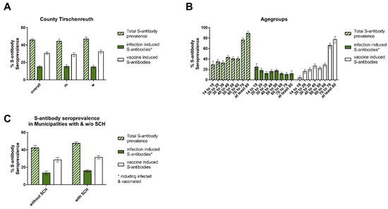 S-specific antibody seroprevalence at FU2. Shown is the standardized S antibody seroprevalence at FU2 (i) counting all S-antibody positive individuals (total prevalence), (ii) counting S-positives that were also N-positive (infection induced antibodies, including vaccinated and unvaccinated individuals) or (iii) counting S-positives that were N-negative (i.e., uninfected but vaccinated individuals), in the overall population of Tirschenreuth (A), by age-groups (B) and for municipalities with or without senior care homes (C).