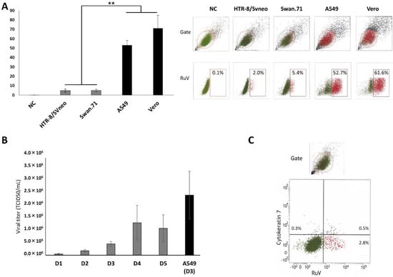 (A) Percentages of RuV-positive gated trophoblast cells determined by FCM analysis and their representative images. Trophoblast cells and reference cells cultured in 96-well plates were incubated with RuV at an MOI from 5 to 10. The cells were harvested from 24 to 48 hpi, stained with anti-RuV capsid protein antibody and then with Alexa-647-conjugated second antibody. The numbers displayed inside each panel correspond to the percentage of the cells positive for RuV capsid protein of the parent gated population. The results are expressed as the mean (±SEM) of at least triplicate experiments in each group, and the graph is representative of three independent experiments. ** p < 0.01. (B) Titers of viral progeny in RuV-infected Swan.71 cell supernatants collected from day 1 to day 5 pi determined by TCID50. The titers of supernatants collected from RuV-infected A549 cells on day 3 pi were used as a positive control. NC, negative control. (C) No exclusive association between RuV-infected HTR-8/SVneo trophoblast cells and cell-surface expression of cytokeratin 7.