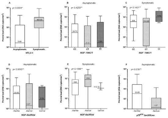 HTLV-1 proviral loads for (A) the asymptomatic and symptomatic groups; for individuals with the NGF -198C/T genotypes in the (B) asymptomatic and (C) symptomatic groups; for individuals with the NGF Ala35Val genotype in the (D) asymptomatic and (E) symptomatic groups; and for individuals with the p75NTR Ser205Leu genotype in the (F) asymptomatic group. * Mann–Whitney test; ** Kruskal–Wallis test; p-value < 0.05: statistically significant; p-value > 0.05: not statistically significant; p-value < 0.01: highly statistically significant.