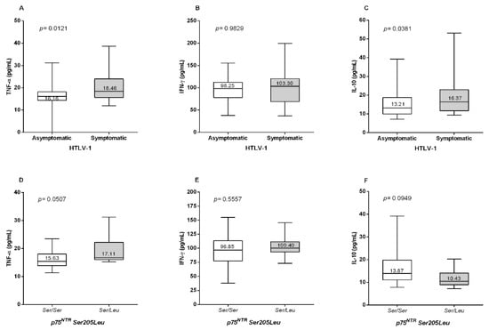 The levels of the TNF-α, IFN-γ, and IL-10 were evaluated in symptomatic and asymptomatic individuals and compared between the p75NTR Ser205Leu genotypes of the asymptomatic group (which indicated significant differences in frequencies between the groups evaluated and variations in viral load levels). The results of the cytokine level evaluation indicated that the symptomatic group had significantly higher levels of TNF-α (p = 0.0121; Figure 2A) and IL-10 (p = 0.0381; Figure 2C). The levels of IFN-γ were not significantly different between the groups (Figure 2B). Regarding the p75NTR Ser205Leu polymorphism, Ser/Leu genotype carriers had higher levels of TNF-α (p = 0.0507; Figure 2D) and IFN-γ, but the differences were not statistically significant (Figure 2E); the carriers of this genotype had lower levels of IL-10 (Figure 2F).