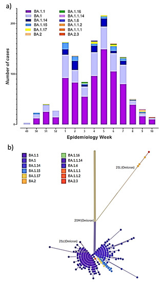 The phylogenetic analysis of the sub-lineages detected is shown in Figure 2b. The sub-lineages clustered into two clades: 21K and 21L, which diverged from 21M. The highest diversity was in the 21K clade, forming two groups with BA.1 and BA.1.1. The 21K clade only showed two sub-lineages corresponding to BA.2 and BA.2.3.