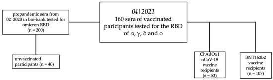 In March 2020, staff from the Department of Nephrology and Dialysis at the Medical University of Vienna were enrolled in a serological follow-up study. In total, 240 participants were enrolled in the study, signed an informed consent form, and allowed the publication of potentially interesting results. The study was reviewed by the ethics committee of the Medical University of Vienna, under the number 1357/2020, as part of the CONEC study (ClinicalTrials.gov no. NCT04347694). The first results were published in 2021 [19,20]. As the pandemic progressed through the different variants, 160 of the 240 individuals participated in vaccination as soon as BNT162b2 or ChAdOx1 nCoV-19 vaccines were available, which were administered in late January through March 2021 (Figure 1). Blood collection occurred within a two-week period starting on 14 March 2020, and later, post-vaccination sera collection started on 7 April 2021. Serum was separated by centrifugation and frozen in aliquots at −80 °C. For each participant, the date and type of vaccination and health-related information were recorded as indicated in the demographic table. A separate aliquot of serum was thawed from each participant who had been vaccinated to perform multipanel ELISA testing for RBD variants (Figure 1).