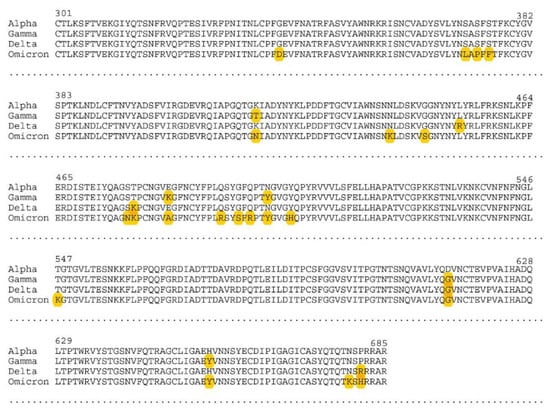 The RBD (300–685 aa) of the spike proteins of the SARS-CoV-2 variants was cloned into the pet-30a vector, and the protein was purified via its His-tag. The amino acid changes in the Gamma, Delta, and Omicron variants compared with Alpha in this RBD region are shown in Figure 2. Equal amounts of the recombinant protein from each variant were applied to 384-well ELISA plates in separate rows so that each participant serum could be tested on the same assay plate for all four variants. This ensured absolute intra-variant comparability for each subject.