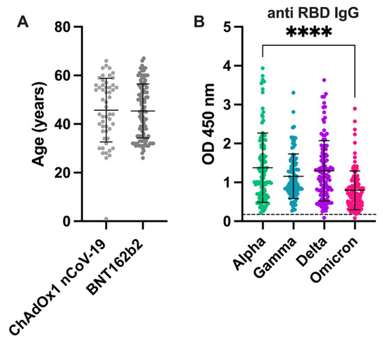 Age distribution of vaccinees and anti-RBD IgG levels against SARS-CoV-2 variants. (A) Age distribution of participants receiving ChAdOx1 nCoV-19 (Oxford/AstraZeneca) or BNT162b2 (Pfizer); (B) Anti-RBD-domain IgG levels detected against the variants Alpha, Gamma, Delta, and Omicron after vaccination regardless of vaccine type; **** p < 0.0001, hyphenated line represents the test cut-off.