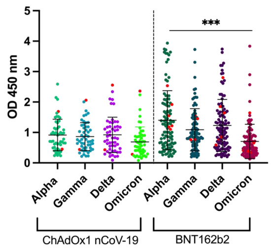Intervariant differences of RBD-specific IgG of ChAdOx1 nCoV-19 (Oxford/AstraZeneca) recipients compared with BNT162b2 (Pfizer). Individuals who tested positive in the nucleocapsid ELISA and were classified as convalescent are marked in bright red. (*** p < 0.001).