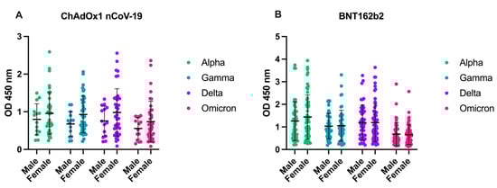 As it is known from clinical data that gender differences in terms of morbidity and mortality among COVID-19 patients exist, the gender effect on IgG production was evaluated and no differences were found (p = 0.779; p = 0.388; p = 0.503; p = 0.700) for Alpha, Gamma, Delta, and Omicron, respectively (Figure 5).