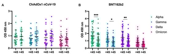 As it has been observed that older individuals are more likely to experience severe COVID-19, the age dependence of IgG antibody production and its cross-reactivity within the variants was evaluated for BNT162b2 and ChAdOx1 nCoV-19 vaccine recipients (Figure 6A,B). The age cut-off was chosen at 45 years as this presented the mean age of the participants (Figure 3A, Table 1). Participants treated with the BNT162b2 vaccine who were younger than 45 years of age developed significantly higher IgG reactivity against the Alpha, Gamma, and Delta variants compared to the group older than 45 years (p < 0.001; p = 0.040; p = 0.004, respectively). There was no age-dependent statistically significant difference in the IgG reactivity against Omicron in BNT162b2 vaccinees or against all variants in ChAdOx1 nCoV-19 vaccinees (Figure 6B).