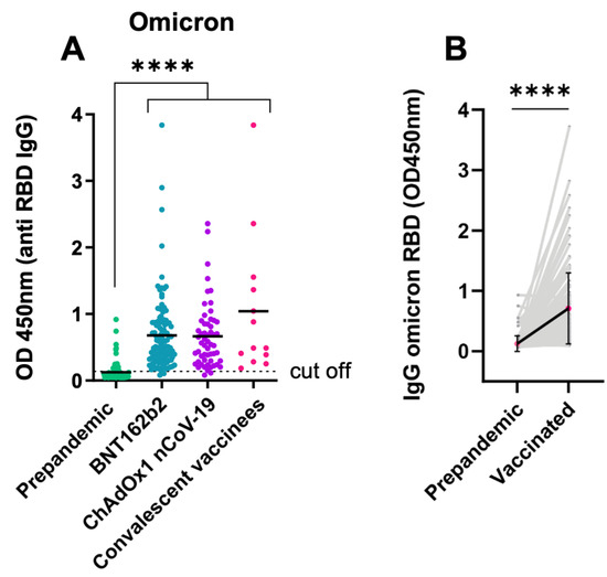 Cross-reactive IgG antibody levels could be found in several pre-pandemic sera but increased significantly after vaccination. (A) Anti-Omicron IgG increasing from the pre-pandemic status upon vaccination with BNT162b2 (Pfizer) or ChAdOx1 nCoV-19 (Oxford/AstraZeneca) vaccine and/or having undergone mild-to-moderate COVID-19 in healthcare workers. (B) Anti-Omicron-RBD IgG increase from pre-pandemic levels, exhibiting cross-reactivity and increase following vaccination with the BNT162b2 or ChAdOx1 nCoV-19 vaccines. For paired samples, Wilcoxon test was applied; **** p < 0.0001.