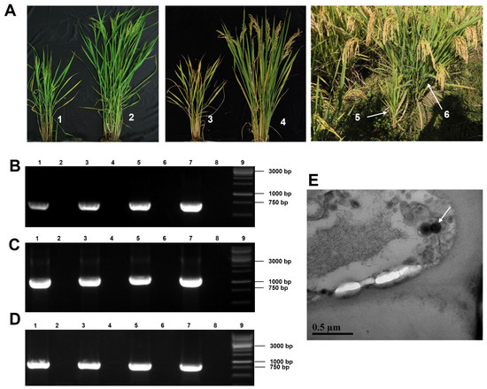 Rice plant symptoms, virions, and RT-PCR detection of the rice dwarf-associated bunya-like virus (RDaBV). (A) Field-collected rice plants showed dwarfing symptoms. Nos. 1, 3, and 5 indicate dwarf plants, and Nos. 2, 4, and 6 indicate non-infected plants. (B–D) RT-PCR detected RDaBV in rice plants using specific primer pairs for RDaBV genomic L, M, and S segments. Lanes 1–6 were field-collected rice plants, as shown in Figure 1A. Lane 7 was an RDaBV-infected rice plant used as a positive control. Lane 8 was a healthy rice plant used as a negative control. Lane 9 was a 1 kb DNA marker. (E) Suspected virus particles of RDaBV were observed using transmission electron microscopy. Scale bar = 5 µm.