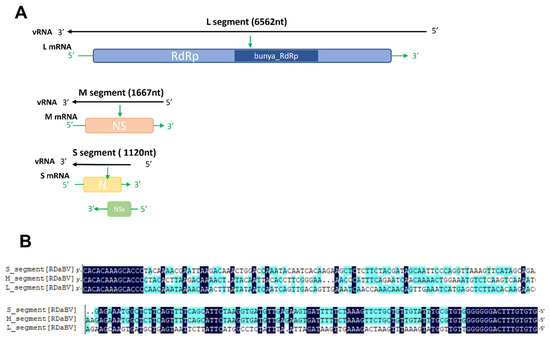 The organization of the RDaBV genome shares similar characteristics with that of viruses in the family Discoviridae in the order Bunyavirales. The RDaBV genome consists of three RNA segments: L, M, and S. The genome organization of RDaBV was determined according to the existence of conserved motifs and previously reported features of bunyaviruses [1,2,3,4]. The L segment encodes an RdRp, and the M segment encodes a nonstructural protein (NS). The RDaBV S segment encodes a nucleocapsid and another nonstructural protein (NSs). The termini of three RDaBV RNA segments have the same complementary conserved sequence CACACAAAG, a feature shared by other bunyaviruses, including melon chlorotic spot virus and rice grassy stunt virus [35,36].
