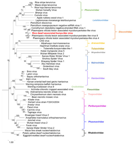 To determine the evolutionary relationship of RDaBV, we retrieved 52 RdRp aa sequences of viruses from 14 families in the order Bunyavirales and one family (Rhabdoviridae) in the order Mononegavirales in the NCBI database (Table S3). We then constructed a phylogenetic tree using aa sequences of the downloaded 52 RdRps and RDaBV RdRp (Figure 3). The phylogenetic tree indicated that the RDaBV is in the same branch as viruses from the family Discoviridae (Figure 3). RDaBV was evolutionarily closer to the Plasmopara viticola lesion-associated mycobunyavirales-like virus 8. This result is consistent with the viral protein identity analyses (Table 1). The family Discoviridae was created by the ICTV in July 2021. The hosts of all six reported viruses in the new family Discoviridae are from the phylums Oomycota and Ascomycota. However, the host of RDaBV is rice.