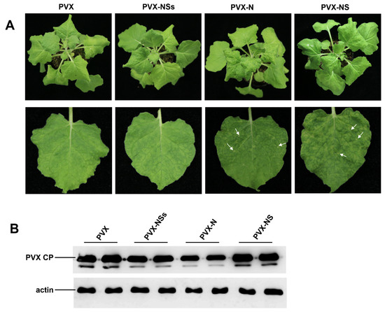 Symptom determinant analysis of RDaBV. (A) Heterologous expression of RDaBV NSs, N, and NS proteins. N. benthamiana leaves were infiltrated with A. tumefaciens harboring PVX-NSs, PVX-N, PVX-NS, or PVX construction. White arrows indicate necrotic patches. (B) Western blot analyzing PVX accumulation levels in N. benthamiana leaves. Actin was used as an internal reference.