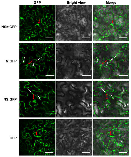To determine subcellular localization patterns in plant cells of viral proteins, RDaBV NS, N, and NSs genes were separately subcloned into the transient expression vector pCambia 1300-GFP to obtain pCambia 1300-NS-GFP (NS:GFP), pCambia 1300-N-GFP (N:GFP), and pCambia 1300-NSs-GFP (NSs:GFP). N. benthamiana leaves were individually agro-infiltrated with these expression vectors, and the green fluorescence was observed at 48 h post-agro-infiltration (hpi). The green fluorescence (from the NSs:GFP, NS:GFP, and N:GFP fusion proteins) was located at the cytomembranes, cytoplasm, and nuclei of N. benthamiana leaf cells, which is similar to that of GFP on its own (Figure 5). Furthermore, NS:GFP and N:GFP fusion proteins formed puncta on the cytomembrane and in the cytoplasm (Figure 5).