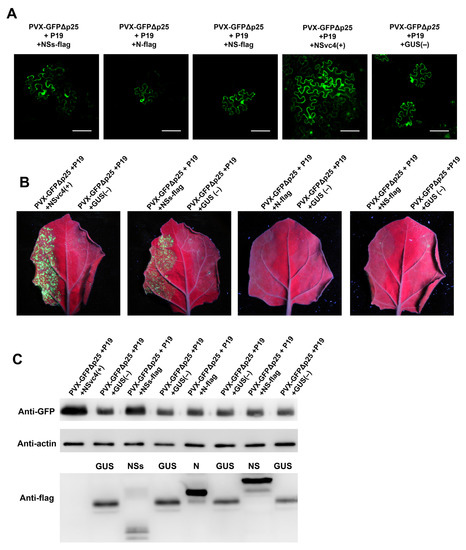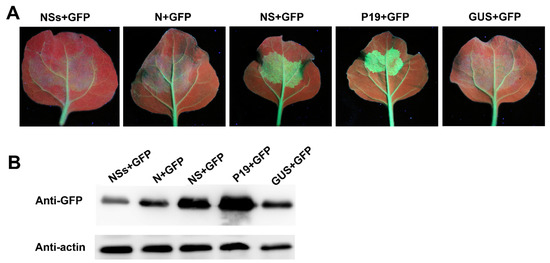 An expression vector expressing a movement-defective potato virus X (i.e., PVX-GFPΔp25) was obtained from a previously published source [29]. The A. tumefaciens strain GV3101 harboring the vector PVX-GFPΔp25 was prepared and diluted to OD600 = 0.001 in an infiltration buffer (10 mM MgCl2, 10 mM MES (pH 5.8) and 100 μM acetosyringone), as previously described [30], and then mixed 1:1:1 (v/v/v) with A. tumefaciens cells harboring a vector expressing the TBSV P19 protein (OD600 = 0.6) and A. tumefaciens cells harboring a vector expressing the rice stripe virus (RSV)-encoded NSvc4 protein (OD600 = 0.6). For other treatments, A. tumefaciens harboring the vector expressing RSV NSvc4 was replaced by A. tumefaciens harboring the vector expressing the new virus NS, N, or NSs protein, or A. tumefaciens harboring the vector expressing β-glucuronidase (GUS). The mixed A. tumefaciens cells were infiltrated into N. benthamiana leaves. At 6 dpi, the infiltrated leaves were examined under a UV light or a confocal microscope.