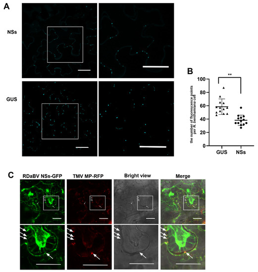 Previous studies have demonstrated that plant virus infections can induce callose depositions around plasmodesmata (PD) to inhibit virus cell-to-cell spread, while viral MPs can reduce callose depositions near PDs [37,38]. To further investigate the function of RDaBV NSs, we transiently expressed NSs-flag or GUS in N. benthamiana leaves. Two days later, the infiltrated leaves were harvested, stained with aniline blue, and examined under a confocal microscope. We found that leaves expressing NSs had fewer aniline blue-stained dots than those expressing GUS (Figure 7A). We counted the number of fluorescence dots in individual cells and confirmed that the leaves expressing NSs had fewer fluorescence dots compared to the leaves expressing GUS (Figure 7B). To investigate whether RDaBV NSs can target PD in cell walls, we co-expressed NSs-GFP and TMV MP-RFP fusion proteins in N. benthamiana leaves through agro-infiltration. Two days later, the leaves were treated with a 1 M sucrose solution followed by a confocal microscopy observation. As the TMV MP (red punctate signal) shows the position of PDs in cell walls, our results provide support for the hypothesis that RDaBV NSs can target PDs (Figure 7C, white arrows).
