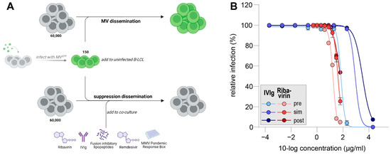 (A) Schematic representation of antiviral dissemination assay. Infected cells are presented in green. (B) Dose–response curves for IVIg (blue) and ribavirin (red) in MV dissemination assay. Addition of inhibitors was six hours pre co-culture (pre, light shading), at the moment of co-culture (sim (simultaneous), medium shading) or six hours post co-culture (post, dark shading). Infection percentages were normalized to untreated cultures and errors are depicting the SEM.