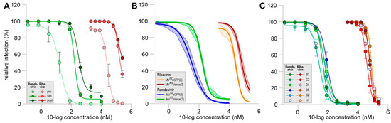 (A) Representative dose–response curves for remdesivir (green) and ribavirin (red) in the MV dissemination assay. Addition of compounds was six hours pre-co-culture (pre, light shading), simultaneous with start of co-culture (sim, medium shading) or six hours post co-culture (post, dark shading). (B) Mean dose–response curves for remdesivir (blue and green) and ribavirin (orange and red) in MV dissemination assay comparing vaccine-strain-based (blue and orange) and wild-type-based (green and red) viruses (n ≥ 5). (C) Mean dose–response curves for remdesivir (green to blue) and ribavirin (red to orange) in MV dissemination assay comparing different clinical isolates (n = 2). (A–C) Infection percentages were normalized to untreated cultures and errors are depicting the SEM.