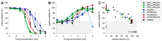 (A) Dose–response curves of three different lipopeptide classes in MV dissemination assay. Peptides depicted in green represent HRC-based lipopeptides, peptides in blue represent FIP-based lipopeptides and peptides in red represent HRC–FIP-hybrid-based peptides. Remdesivir (black) was used as a control. Infection percentages were normalized to untreated co-cultures, and errors are depicting the SEM. (B) Relative viability of co-cultures treated with different lipopeptides and infected with rMVKSVenus(3). Shaded background depicts mean viability in infected but untreated co-cultures. Error bars depict the SEM. (C) Correlation of infection percentage and viability in infected and treated co-cultures. Shaded background depicts mean viability in infected but untreated co-cultures.
