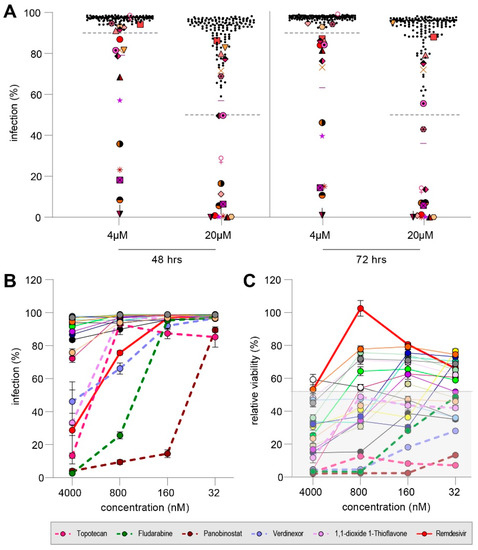 (A) Infection percentage reached in co-cultures treated with 160 diverse compounds at 4 µM or 20 µM evaluated at 48 hpc (left) or 72 hpc (right). Dotted lines indicate cut-off to qualify for re-screening. Overall, 21 compounds reduced MV dissemination (enlarged colored symbols, one symbol per compound). (B) Rescreening of 21 compounds and remdesivir for their inhibitory effect on MV dissemination. Dotted lines indicate compounds regarded effective. Error bars depict the SEM. (C) Relative viability of all 21 compounds and remdesivir. Dotted lines indicate compounds which were regarded effective, but proof to be cytotoxic. Shaded background depicts mean viability in infected but untreated co-culture.
