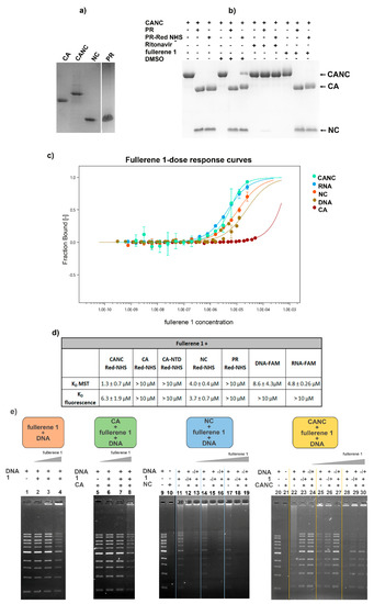 Interactions of fullerene 1 with HIV-1 CANC, CA, NC, and PR analyzed by microscale thermophoresis measurement (MST) and electrophoretic mobility shift assay (EMSA). (a) SDS PAGE of HIV-1 proteins used in MST and EMSA analysis. (b) HIV-1 PR following THS-RED labeling was tested for its proteolytic activity using the indicated samples. (c) Dose–response plot of different concentrations of fullerene 1 after the interaction with fluorescently labeled HIV-1 proteins and nucleic acids calculated from MST analysis. Error bars represent standard deviations. (d) Dissociation constants (KD) calculated from MST for fullerene 1 and indicated HIV-1 proteins. (e) EMSA: the same amounts of DNA (200 ng) and HIV-1 protein (1 μM) were used in all samples. The concentrations of 1 (1, 2, and 5 μM) at the final molar ratios of protein:fullerene 1 corresponding to 1:1, 1:2, and 1:5 were used. Orange panel: DNA was incubated with DMSO (1%) (lane 1) or with various amounts of 1, corresponding to 1, 2, and 5 μM in 1% DMSO (lanes 2–4); green panel: HIV-1 CA was incubated with DNA (lane 5) or with various amounts of 1, corresponding to 1, 2, and 5 μM (lanes 6–8). To analyze the interactions among HIV-1 NC, 1, and nucleic acid (blue panel), two experiments were performed. In one, NC was first incubated with DNA and then with 1 (1, 2, or 5μM) at the final molar ratios 1:1, 1:2, and 1:5 (lanes 12, 15, 18 respectively). In the second, NC was first preincubated with the various amounts of 1, and then incubated with DNA (lanes 13, 16, and 19). As controls, NC was incubated with DMSO (1%) in the absence of 1 (lane 10), and DNA was incubated with the various amounts of 1 (lanes 11, 14, and 17). CANC’s interactions with 1 and DNA (yellow panel) were tested identically as described for NC: CANC was preincubated with DNA, and then with 1 (lanes 23, 26, and 29), or CANC was preincubated with various amounts of 1, and then incubated with DNA (lanes 24, 27, and 30). DNA binding to various amounts of 1 was also analyzed (22, 25, and 28). All samples were incubated for 40 min at RT and then analyzed using 0.8% agarose gel electrophoresis, stained with Gel Red, and visualized with a Quantum gel documentation imaging system (Vilbert Lourmat).