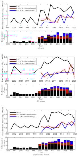 Mortality from CHC as an underlying or contributory cause of death was lower among women than men (Figure 1, Table S1). Including CHC as a contributory cause of death resulted in a nearly two-fold increase in mortality related to CHC. During the study period, no steady trend in mortality from all groups of death was observed. The years when mortality was highest or lowest varied between gender and cause of death. In 2020, mortality from CHC coded as an underlying cause and unspecified liver cirrhosis with CHC as a contributory cause decreased, while mortality from hepatocellular carcinoma with CHC as a contributory cause increased, especially in men, compared to previous years.
