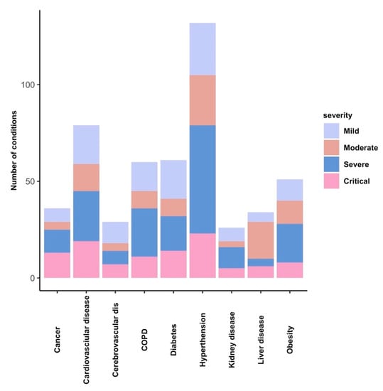 Distribution of preexisting conditions in our group of COVID-19 patients. Number of patients in the disease severity groups illustrated for all subgroups of comorbidities.