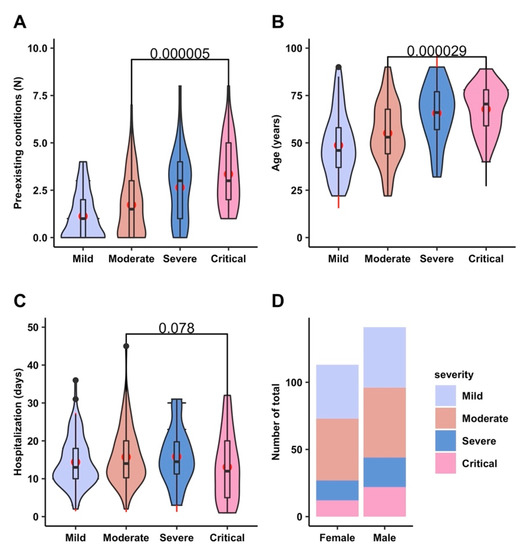 Characteristics of our group of COVID-19 patients. Distribution of preexisting conditions (A), age (B), and hospitalization days (C) in disease severity groups. Percentages of disease severity in female and male patients (D). Data are presented as violin plots with medians (A–C).