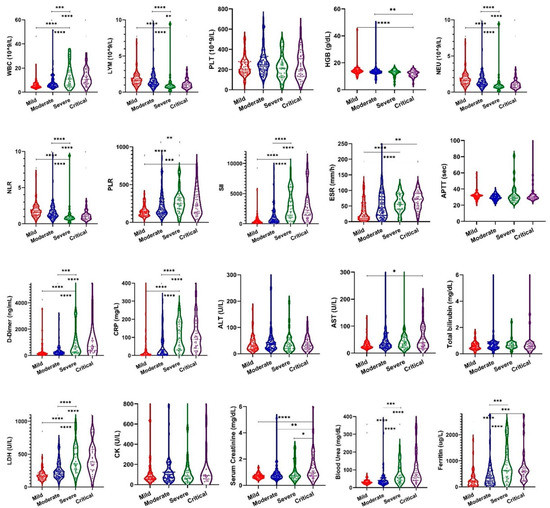 Violin plots showing distribution of laboratory parameter levels on admission. Boxplots indicate median and interquartile range. WHO severity indicates the highest disease severity of the patients during hospitalization. Mild n = 85 samples; moderate n = 98 samples; severe n = 34 samples; critical n = 37 samples. The asterisks indicate that the difference between two groups is significant (* p < 0.05; ** p < 0.01; *** p < 0.001; **** p < 0.0001).