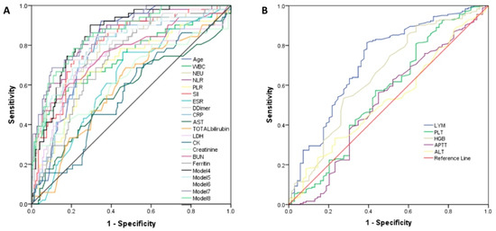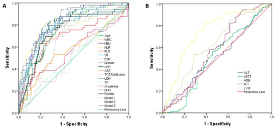 Receiver operating characteristic (ROC) curves for the individual laboratory parameters and models for prediction of disease severity. (A) The analysis of AUCs (area under the curve) for age, WBC, NEU, NLR, PLR, SII, ESR, D-dimer, CRP, AST, total bilirubin, LDH, CK, creatinine, BUN, ferritin, and models 1–3; (B) ALT, APTT, HGB, and LYM.