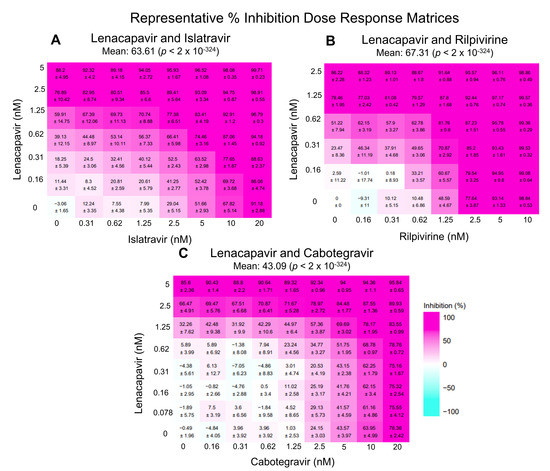 Representative percent inhibition dose response matrix of LEN with ISL, RPV, or CAB. Above demonstrates representative matrices (made with SynergyFinder Plus) of various percent inhibition at each individual dose-response point as well as the overall percent inhibition with the combinations studied: (A) LEN and ISL, (B) LEN and RPV, and (C) LEN and CAB. All negative values are corrected for in SynergyFinder Plus.