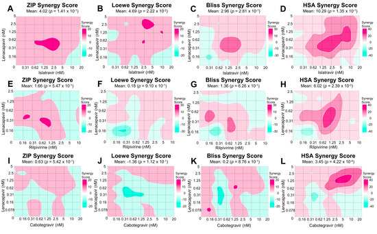 To thoroughly evaluate interactions between antivirals we analyzed the data from combination studies using SynergyFinder Plus, a calculator that evaluates synergy applying the four most used models: Zero interaction policy (ZIP), Loewe additivity (LOEWE), Bliss independence (BLISS), and highest single agent (HSA). The different models operate under distinct assumptions, presented in Discussion. p-values are also determined by comparing the experimental data to the null hypothesis, a synergy score of zero. While mean score values near zero are interpreted as evidence for additive interactions, a +5 or higher value is considered synergistic, and a −5 or lower antagonistic, when combined with a significant p-value [11]. To determine whether LEN was synergistic with ISL, CAB, or RPV, we performed a matrix of dose-response curves with these drug combinations (Figure 1).