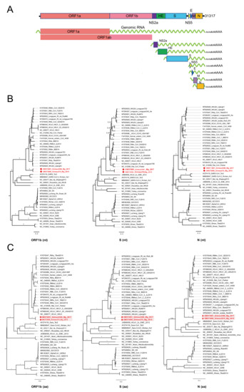 (A) Genomic RNA and subgenomic mRNAs organizations of Grimso virus, Grimso215 strain. MrBayes trees based on the complete nucleotide sequences (B) and amino acid sequences (C) of ORF1b, S, and N genes of CoVs. The red color shows Grimso virus. The scale bar indicates the nt and aa substitution per site, respectively. The numbers above the branches indicate the posterior probability.