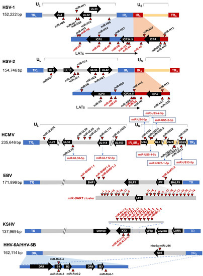 Genomic locations of human herpesvirus miRNAs. The locations of miRNA precursors are denoted by red triangles. Red characters indicate the miRNAs expressed during latent infection. Thick arrows along the genomes represent selected viral genes and the directions of transcription.