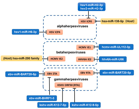 | Repression of viral lytic genes | Viral | hsv1-miR-H2-3p hsv2-miR-H2-3p | ICP0 (viral) | [10,14,40] |
