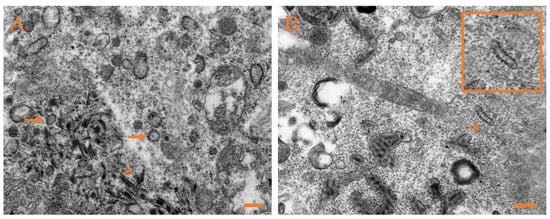 Transmission electron micrographs of JFB cells inoculated with CSBV Bces-Po19. (A) Arrows indicate the spherical virions; asterisk indicates viral-like tubular structure. (B) Asterisk indicates bacilliform virion. (C) Arrow indicates the spherical virion budding from the infected cell membrane; asterisk indicates bacilliform virion. (D) Transmission electron microscopy (negative staining) of purified virions from the JFB cell supernatant. Orange asterisks indicate bacilliform virions; white asterisks indicate spherical virions. Scale bars: 200 nm.