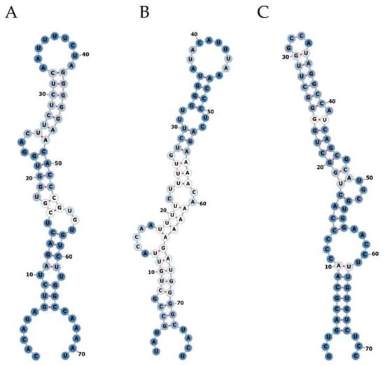 Secondary structure prediction of potential HBV encoded miRNAs. Small NGS of liver tissue from CHB patients revealed three pre-miRNA-like hairpin structures encoded by the HBV genome. The RNA secondary structures of the small RNAs named HBV-miR-6 (A), HBV-miR-7 (B), and HBV-miR-8 (C) were assessed using the mfold web server online tool. A: adenine; C: cytosine; G; guanine; U: uracil. Optimal base pairs are represented by red line between the two nucleotides. The intensity of the blue color represents the level of promiscuity in the association of any given nucleotide or helix with alternative complementary pairs (dark blue been lower and white higher). The numbers indicate the corresponding nucleotide position in the total sequence.