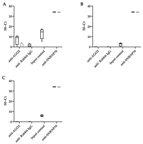The RIP assay was performed using the EZ-Magna RIP™ RNA-Binding Protein Immunoprecipitation Kit (Merck KGaA, Darmstadt, Germany), according to the manufacturer’s protocol. HepG2 and HepG2.2.15 cells were lysed and miRNAs bound to RISC were immunoprecipitated using an argonaute-2 (AGO2) monoclonal antibody (H00027161-M01, Abnova, Taipei City, Taipei, Taiwan). Immunoprecipitations using either small nuclear ribonucleoprotein U1 subunit 70 (SNRNP70) or a mouse IgG antibody were performed as positive and negative controls, respectively. After immunoprecipitation, RNA was isolated using TriPure (Roche Diagnostics, Almere, The Netherlands) and expression of the miRNAs and U1 snRNA was measured using RT-qPCR.