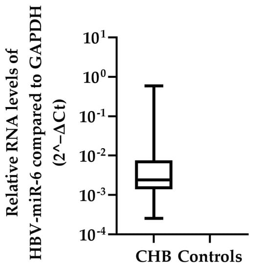 Hepatic HBV-miR-6 expression levels in CHB patients. HBV-miR-6 expression levels were measured in liver tissue derived from 87 CHB patients and 13 HBV negative controls using qPCR. Relative expression levels of HBV-miR-6 were normalized to GAPDH expression using the 2^−ΔCt method; the data are presented as a boxplot and whiskers.