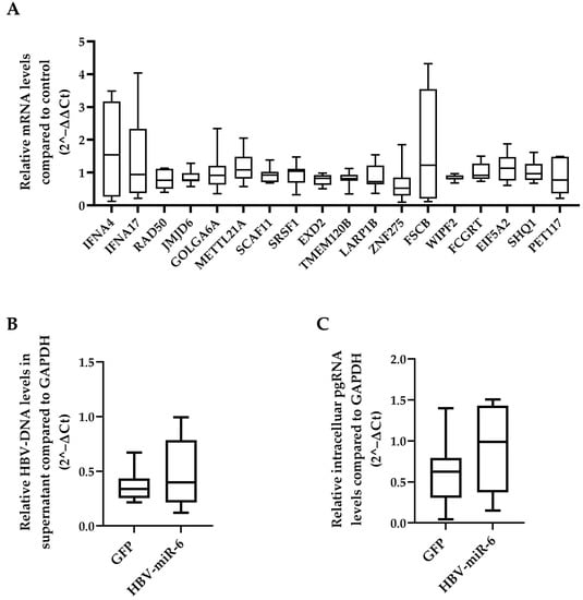 A total of 25 different genes that are potentially targeted by HBV-miR-6 were identified using the miRDB prediction software database [19,20] (Supplementary Table S2). The effect of HBV-miR-6 on the expression levels of all these potential target genes was investigated in HepG2 cells transduced with a lentiviral vector expressing HBV-miR-6 or GFP. We observed that mRNA expression levels of none of the target genes differed between HepG2 cells that did or did not overexpress HBV-miR-6 (Figure 4A).