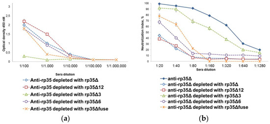 Characterization of pooled anti-rp35Δ sera after depletion. (a) Indirect ELISA evaluating binding of depleted anti-rp35Δ sera with the corresponding depletion antigen; (b) in vitro neutralization of VACV with serial dilutions of pooled anti-rp35Δ sera depleted with rp35Δ, rp35Δ3, rp35Δ6, rp35Δ12, and rp35Δfuse. The initial dilution of sera was 1:20. VACV was diluted to 320 pfu/mL. The data from three or more independent experiments are shown.