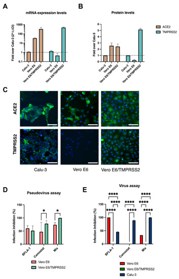 In accordance with the mRNA level investigation, the IF analysis confirmed the discrepancies between the expression levels of ACE2 and TMPRSS2 between Vero E6, Vero E6/TMPRSS2 and Calu-3. ACE2 levels were remarkably higher in Vero E6 and engineered Vero E6 compared to Calu-3. Our studies confirmed the lack of TMPRSS2 expression in Vero E6 cells, which, in contrast, was overexpressed in engineered Vero E6 (four-fold higher) compared to human-derived cells.