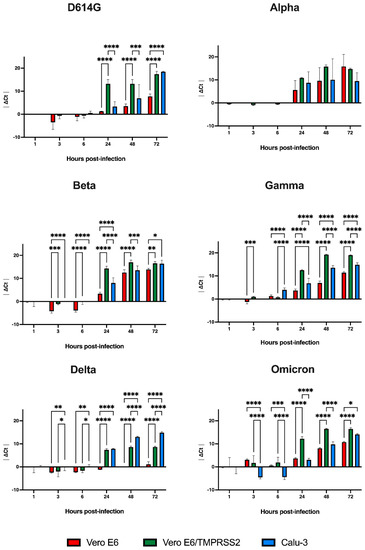 However, we observed that results from Calu-3 and Vero E6 experiments with Beta and Omicron infections came closer at the last time point (72 hpi, p < 0.05). The data obtained from the analysis of the Gamma infection of Calu-3 cells were the only data that diverged from the other two cells starting from 6 hpi (p < 0.0001), and the differences between wild type and engineered Vero E6 cells were detected already at 3 hpi (p < 0.001) and became more statistically significant from 24 hpi (p < 0.0001).