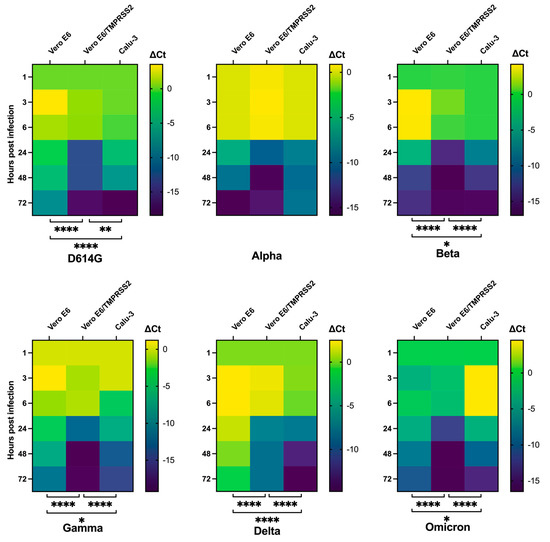 Replication kinetics trends of SARS-CoV-2 variants in the different cell lines. Heatmaps comparing ΔCt values obtained from the three cell lines at the selected time points for the tested viral variants. The ΔCt were reported as the mean values ± SD, * p < 0.05, ** p < 0.01 and **** p < 0.0001. Ct: threshold cycle.