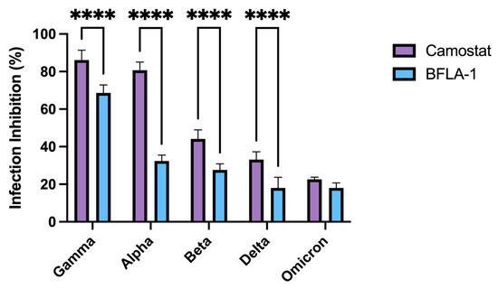 The two entry pathways differently exploited by SARS-CoV-2 viral variants to infect Calu-3 cells. Graph showing the BFLA-1 and camostat mesylate inhibitory activity against VOCs: Alpha, Beta, Gamma, Delta and Omicron. Cells were pre-treated 1 h before the infection, and the cell supernatants were collected at 72 h. Each condition was tested in triplicate, and the results were normalized over controls. The infection inhibition percentages were reported as the mean values ± SD, **** p < 0.0001.