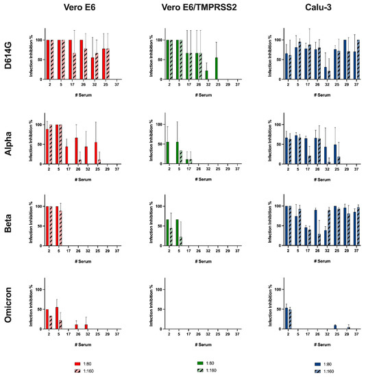 The results obtained on Vero E6 cells showed that almost all the selected sera efficiently neutralized the D614G variant (1:80 sera dilution: 88.89 ± 18.59%, 1:160 sera dilution: 81.48 ± 15.18%), and the neutralizing activity gradually decrease when the Alpha, Beta and Omicron variants were tested, as the more effective sera (#2 and #5) dropped to 50% of infection inhibition (Figure 5). The assays performed using engineered Vero E6 cells showed an even more marked reduction in activity against the different variants, culminating in a zero inhibition of the serums against Omicron.